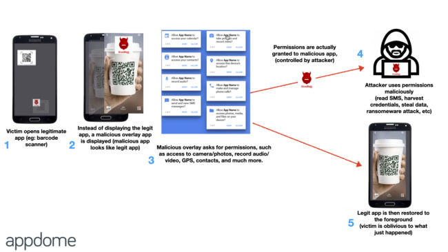 In order for an overlay attack to be successful, the malicious content must be non-obvious to users and undetectable by malware detection software, and the methods that StrandHogg uses to abuse Android functions do exactly that. You can read more about overlay attacks in this blog. I’ll now explain how StrandHogg does all of these nasty things, how it can exploit both host apps and target apps, and how it abuses normal Android functionality, a classic example of OWASP “Improper Platform Usage”. But don’t worry, with Appdome you can block StrandHogg malware from attacking your Android apps. Keep reading to learn how.