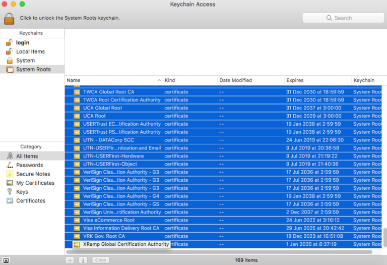 - To select all the certificates at once, click on the top entry, scroll down to the bottom of the list, and click on the bottom entry while holding the “Shift” button on your keyboard.