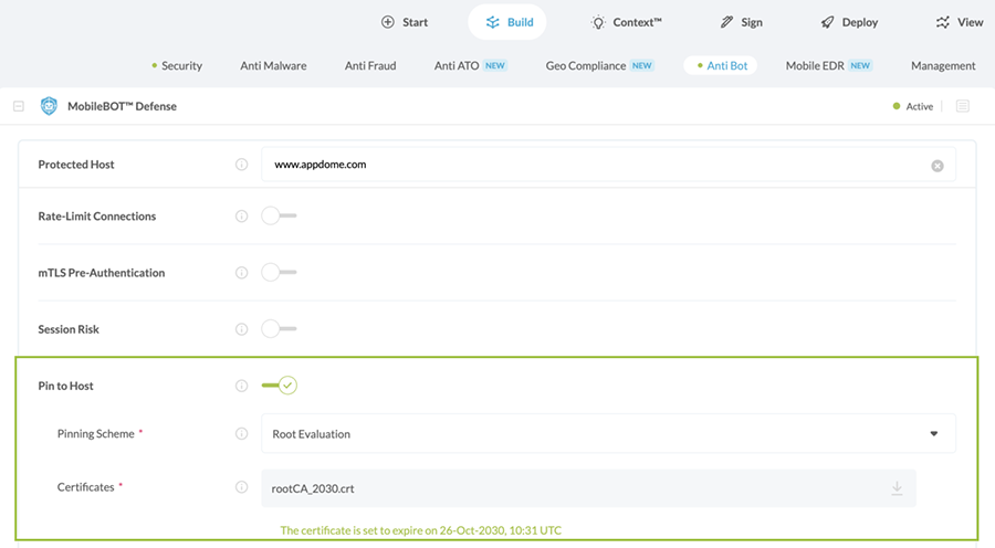 • Root Evaluation – only evaluates that the root CA returned for the specified domain/host (FQDN) matches the Root CA Certificate uploaded to Appdome. Because the CA certificates are valid for 10+ years, this setup will not require updates when the leaf certificate or the intermediate certificates are renewed (i.e., the server can return an updated intermediate or leaf certificate without invoking a security event). By pinning against the root certificate only, any changes to the customer’s intermediate or leaf certificates will work without having to update the app.