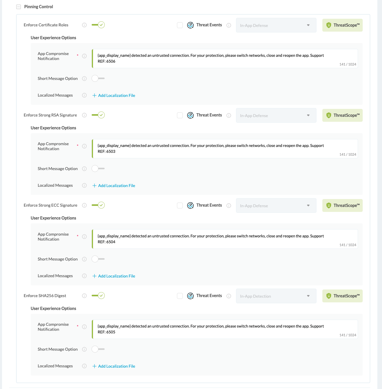Appdome offers the following mutually exclusive pinning schemes (aka: pinning profiles) to implement Certificate Pinning in any iOS or Android app:
