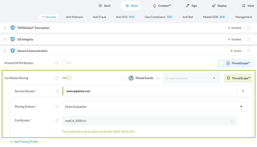 • Chain Evaluation – verifies the chain of trust for the Root and Intermediate Certificates uploaded to Appdome. It ensures that only intermediate and leaf certificates trusted by the uploaded certificates are accepted, effectively locking the chain of trust. Any mismatch triggers a security event.