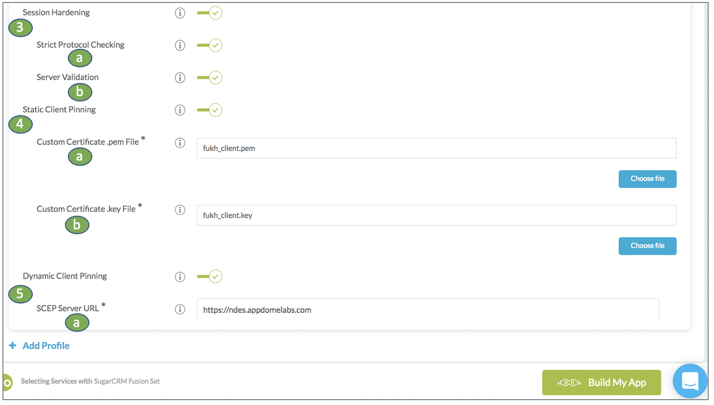 4. Static Client Pinning  – This pinning allows client-side certificates to be added to the Built App for connecting with servers that require them.