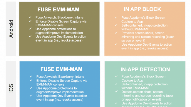 Either way, Appdome’s implementations cover all forms of screen capture – screenshots, screen recording and mirroring. So, we offer 360Ëš protection with or without an EMM-MAM.