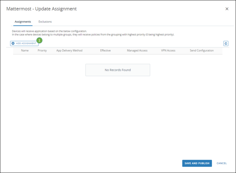 * The Assignment window will open automatically after clicking Save & Assign. It can also be opened manually to change the assignment for existing apps by opening the apps page and clicking Assign.