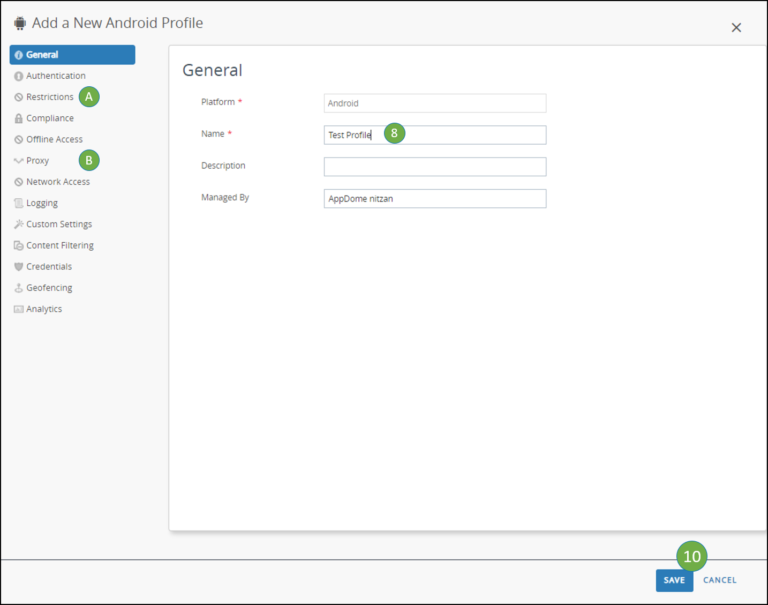 9. Configure the Security Profile. A. Configure Data Loss Prevention under Restrictions, Configure the App Tunnel under Proxy. You can read more about the Default SDK Security Settings and SDK Profiles, Policies and Settings Compatibility in the VMWare Workspace ONE (AirWatch) Knowledge Base.