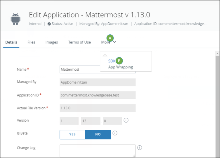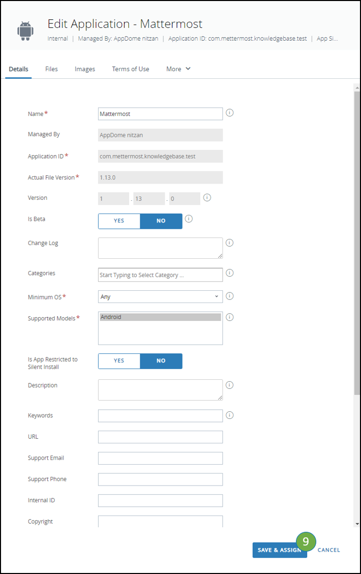 9. The application edit page will open. You can configure the app’s basic set up here. If you want to apply a specific security profile to the app, you can do it under More–>SDK (see Manage VMWare Workspace ONE (AirWatch) Security Policies, below). Configure the app and click Save & Assign.