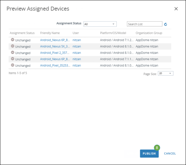 8. The Preview Assigned Devices shows a list of devices that will be assigned the new app. Click Publish.
