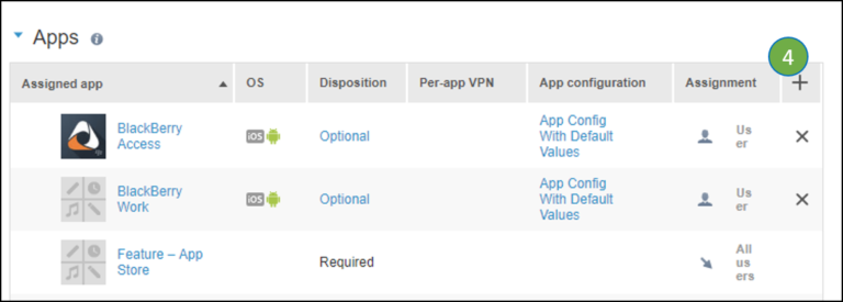 4. Click the ‘+‘ button on the Assigned apps table.