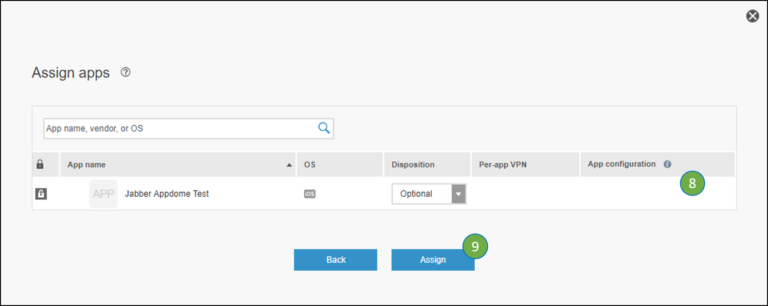 8. Select Disposition (Optional, Required or Denied installation). If App configurations are available to the app you can select an App configuration to be assigned to the user.