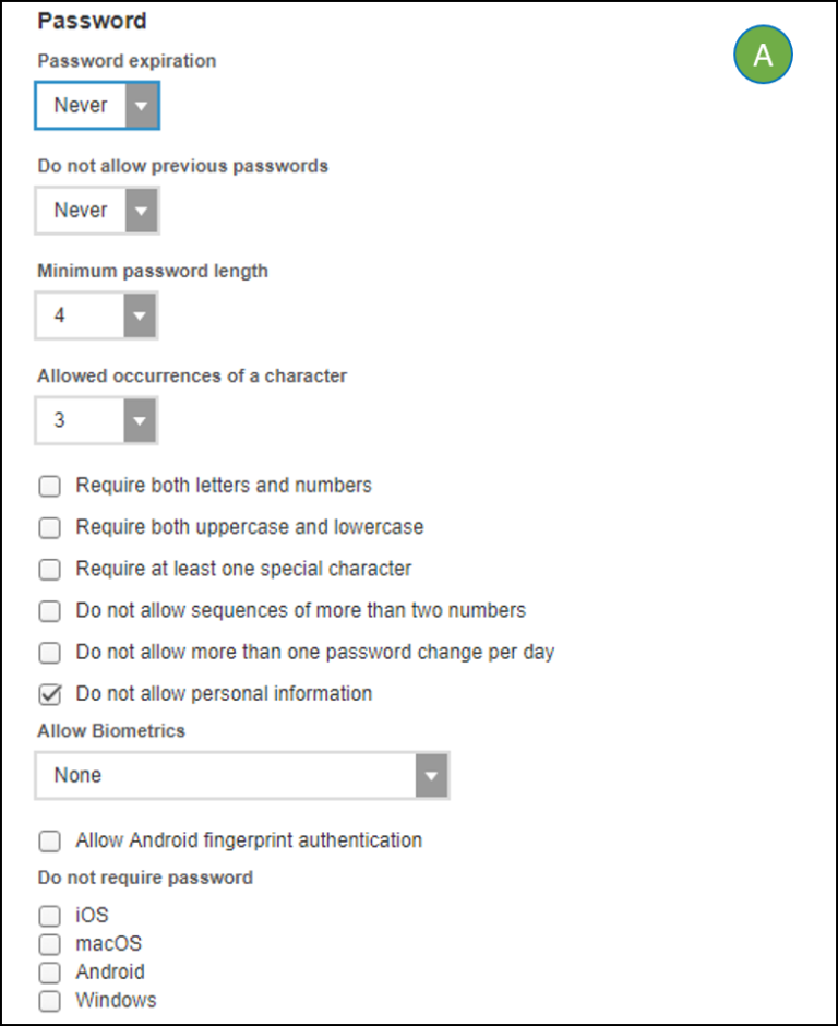 Password: The type and setting of the password protecting apps governed by the profile.