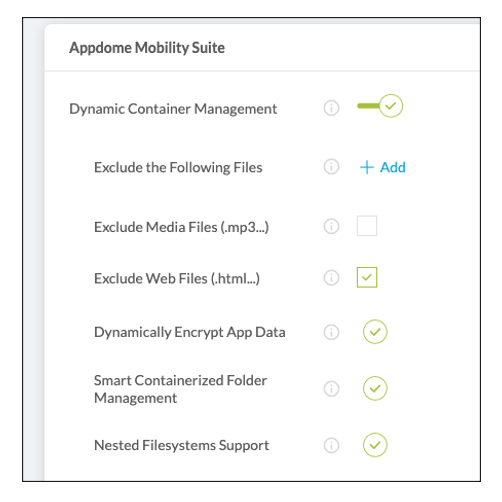 • Dynamic Container Management™ – This is an EMM or MAM container optimization feature that ensures mobile app performance is not impacted by EMM and MAM SDKs. This feature leverages Appdome’s proprietary Dynamic Container Management methods and provides users with an easy way to configure TOTALDataTM Encryption, Folder Management, and Nested Filesystems.