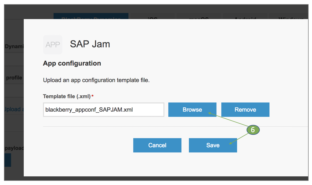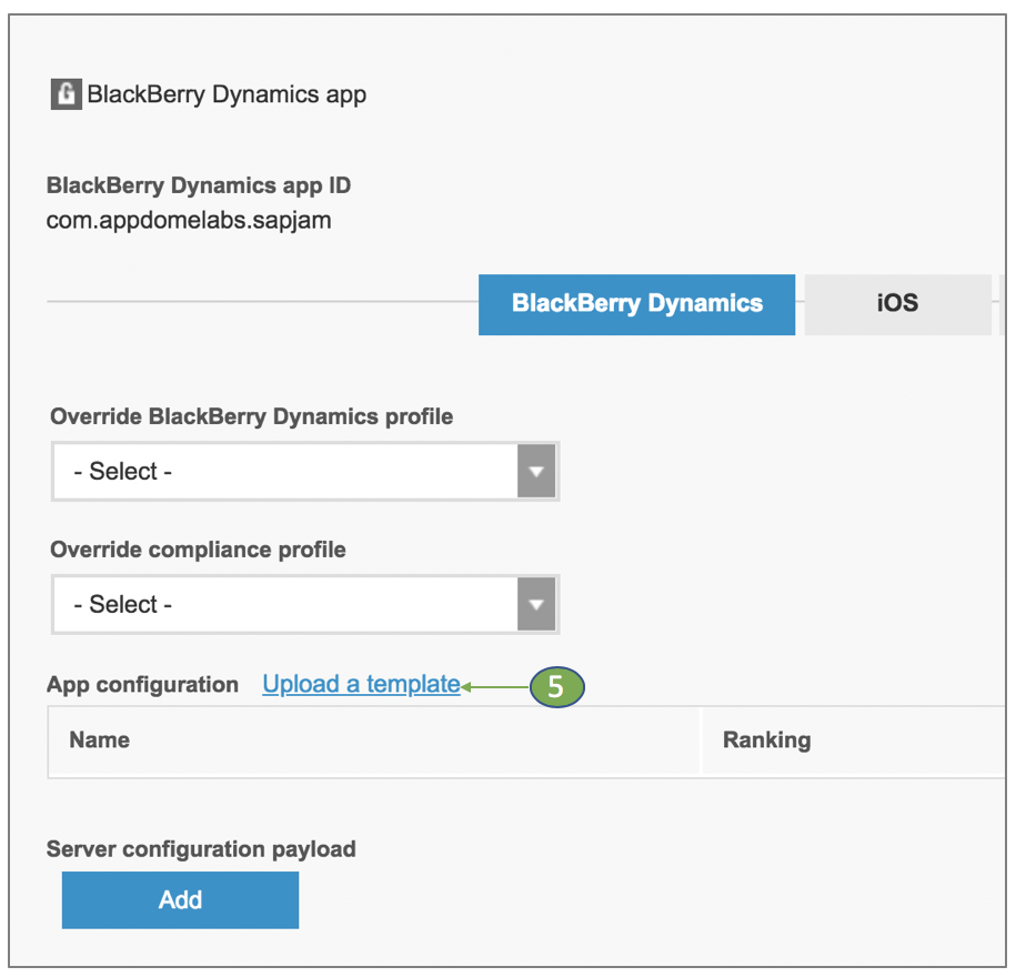 5. Under BlackBerry Dynamics, click Upload a template next to App configuration